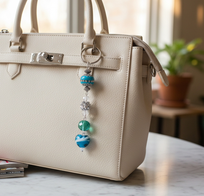 This unique handcrafted beaded bag charm in blue is the perfect gift to adorn your purse, handbags, or backpack. Its gorgeous design adds a touch of elegance and uniqueness to any bag, making it a standout accessory. Handmade with care, it's the perfect accessory for any bag lover.