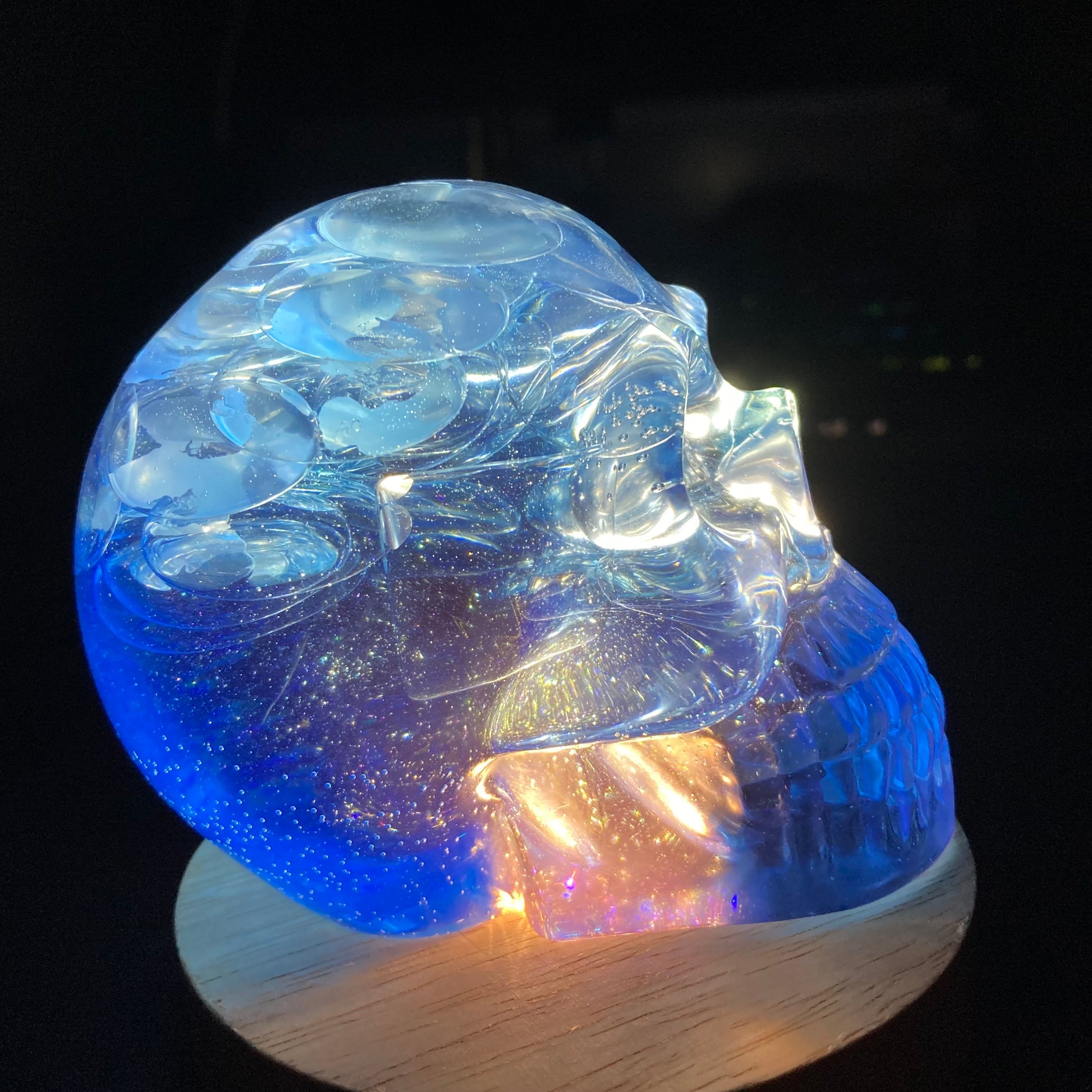 Handcrafted with resin, the Blue Skull Lamp is a one-of-a-kind home decor piece that will be sure to make a statement in any room. Perfect for Halloween enthusiasts, its unique design will make it a standout gift for any occasion. Add a touch of spookiness to your home with this expertly crafted lamp.
